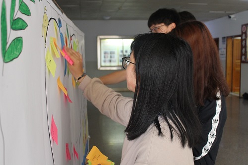 启动仪式上,李雯同学详细地介绍了本次活动的主要内容,即心理班会、观看心理电影、心理沙龙、大型户外活动等,丰富多彩的活动充分激发了同学们的兴趣,也调动了同学们参与活动的积极性。随后,主持人要求同学们将自己的愿望和祝福交付给“心愿便利贴”。话音刚落,同学们便纷纷起笔,一边思考一边落笔,写下自己的心愿,脸上洋溢着幸福笑容,现场气氛十分欢悦,不一会儿一张又一张的“心愿便利贴”张贴在了展板上,展板花花绿绿,承载着同学们美好的心愿和满满的祝福。