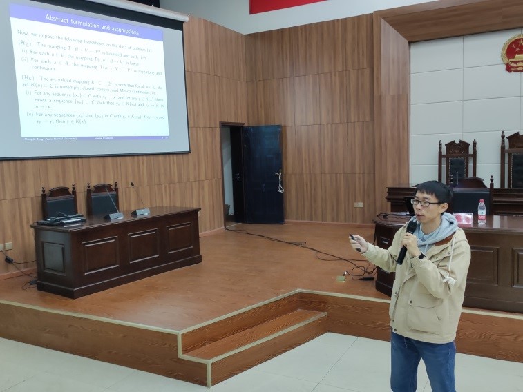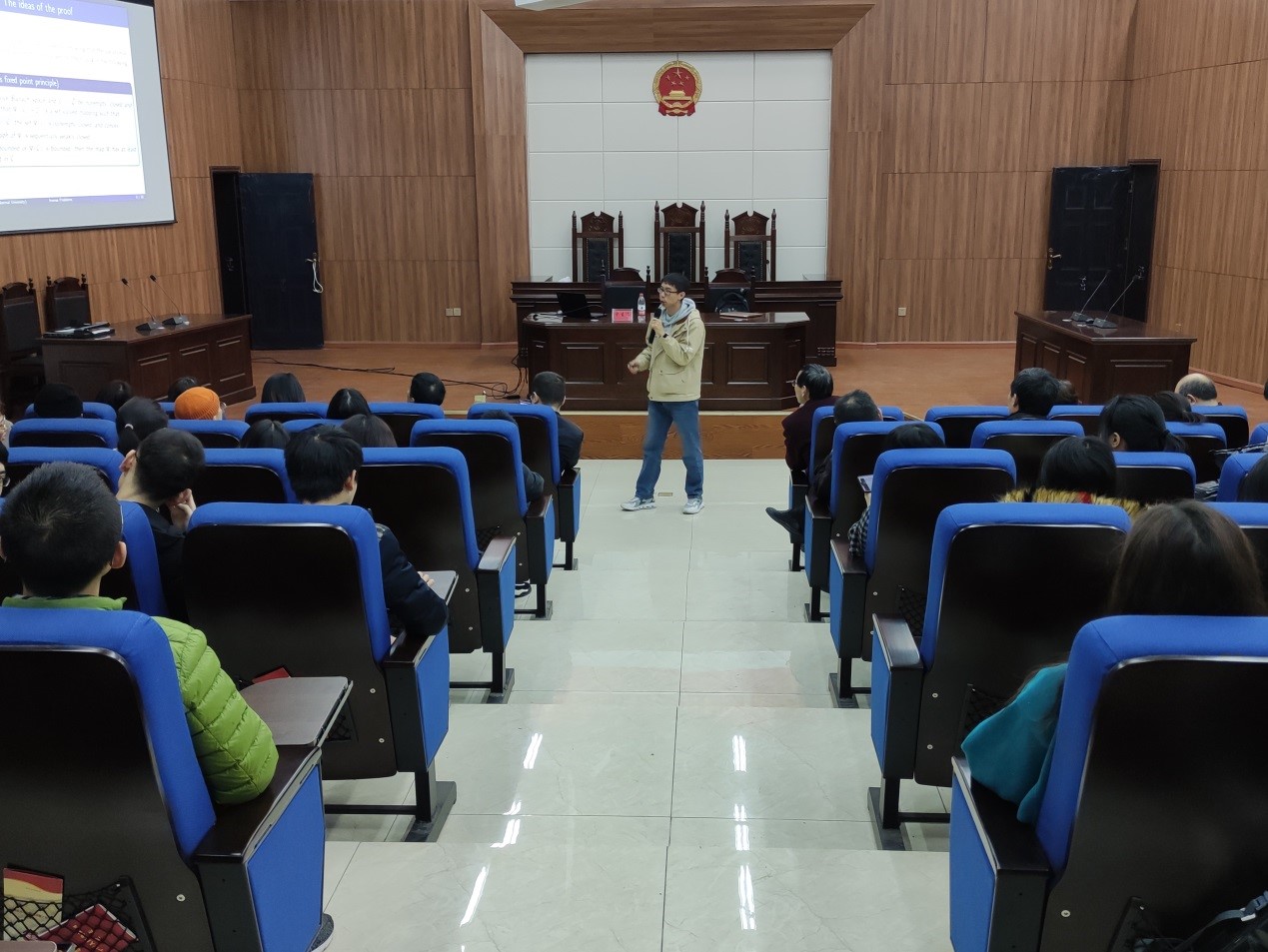 曾生达教授首先以“课程思政”的方式介绍了他自己和他的母校,激起了同学们对本次讲座的期待。随后,曾教授以“Inverse Problemsfor Nonlinear Quasi-Variational Inequalities with an Application to Implicit Obstacle Problems of p-Laplacian Type”为题,介绍并汇报了他所研究的主要内容,跟聆听报告的同学和老师,针对相关学术前沿话题进行了深度交流。同时曾教授还跟老师们分享如何申报高级别项目和撰写高水平学术论文的经验。最后,曾教授以自己的求学经历为例,就如何考研择校与出国留学,跟聆听报告的同学们进行了交流,鼓励同学们毕业后进一步深造。