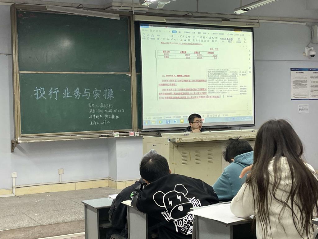 金融数学专业于12日邀请唐彬彬老师在博文楼412教室开展银行专业和保险专业专题讲座,唐老师结合当下时事热点,个人经验和专业发展,用幽默风趣的语言向同学们介绍了市场类别,券商业务,投行业务等具体情况。13日泰康人寿保险公司熊久翔经理、应用统计学专业员工李永红在博文楼412教室分别为应用统计学专业和金融数学专业员工作见习专题讲座。