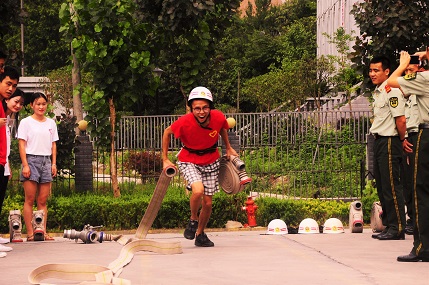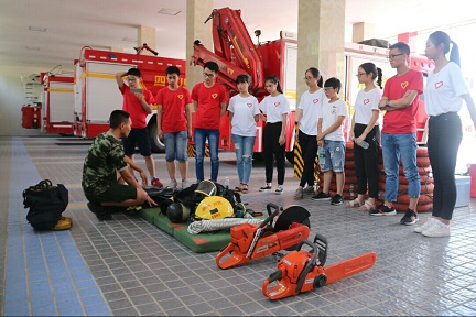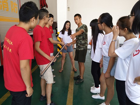 在午餐前由消防官兵教我们唱军歌《团结就是力量》。在下午时分,我们零距离的接触体验消防员们在灭火时所用的消防服、空气呼吸器、切割机以及各类消防车等消防器材装备,之后渠县消防大队副大队长王豪和政治指导员程荣军给我们小组开了一次会议;晚上,在吃完晚饭后,我们小组的10个成员和消防官兵们一起进行了部队日常训练科目,进一步体验消防官兵们的生活。