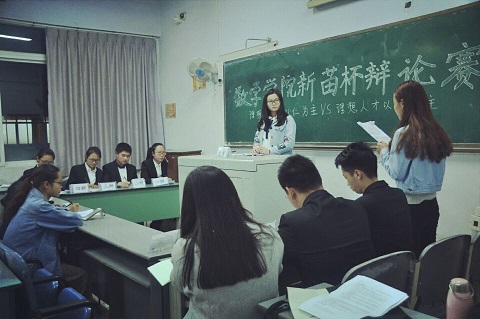 活动在同学们热烈的掌声中拉开帷幕,往届优秀辩手顾永春、麻安鹏首先介绍了一些辩论赛的规则及其中的注意事项之后,大战正式开始了。同学们语气铿锵有力,语言精妙绝伦,一方从容自若,口若悬河,另一方也气定神闲,滔滔不绝,双方各据一势,时有语惊四座!经过一番激烈的争论以后,各自不甘示弱,唇枪舌战之间似乎透着一股浓浓的杀气,台下片片叫好之声,气氛空前。