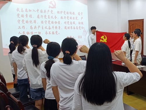 “我志愿加入中国共产党,拥护党的纲领,遵守党的章程,履行党员义务,执行党的决定……”参加会议的党员同志面对党旗,庄严宣誓,一起重温入党誓词,坚持为中国共产主义奋斗终身。