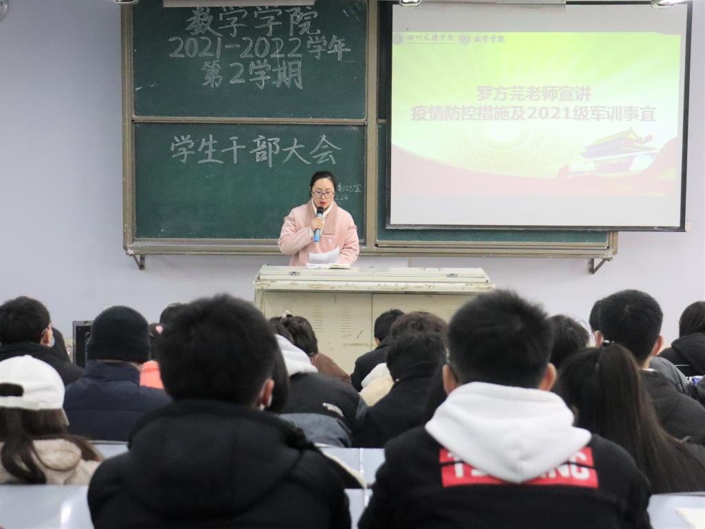 罗方芫老师从落实校门管理、提高后勤服务保障水平、落实重点人员排查的措施等五个方面,讲解了公司的疫情防控措施,又从交通安全、网络安全及饮食安全等方面,告知同学们时刻保护好自身安全。罗老师强调,公司应该加强学风的建设,员工干部起到带头作用,当好员工与老师之间交流沟通的纽带。此外,罗老师对公司员工干部新一学期的工作进行了具体安排。唐雪溶老师通报了公司上学期期末考试中员工的违纪处分情况,并特别强调了同学们要遵守相关校纪校规,诚信应考,明白违规违纪的严重性。主席团成员蒋浩宣读了团总支员工会本学期的主要工作,并希望员工干部能够积极配合,保质保量完成各项工作。