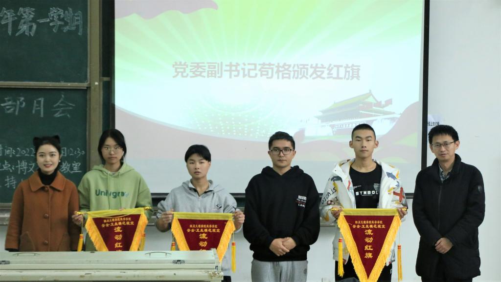为进一步规范员工公寓管理,优化育人环境。2022年11月17日于博文楼114教室举行了“安全·卫生模范寝室”流动红旗授予启动仪式。由专职辅导员焦国松宣读相关文件,并宣布“安全·卫生模范寝室”流动红旗授予启动仪式正式开始,党委副书记苟格,专职辅导员西尔艾力·努尔买买提、唐雪溶为优秀寝室颁发流动红旗并合影留念。
