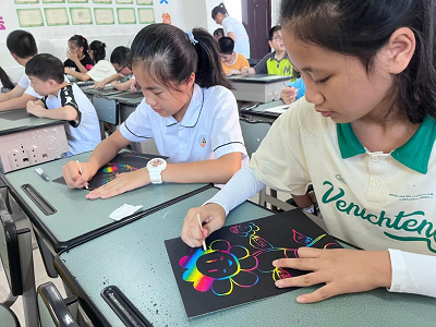 诚以童心作画,助力梦想起飞。实践团队为小朋友赠送画纸和画笔,让他们进行自由创作,画出自己的心中所想,小朋友通过这样的美育课堂,学会如何了解美,发现美,创造美。