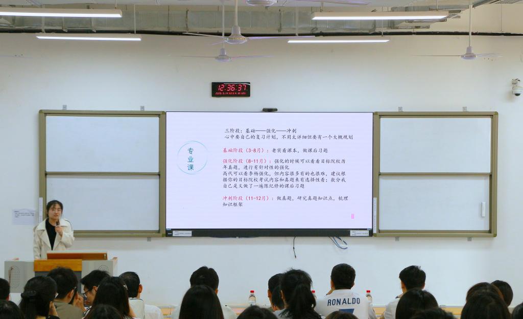 随后,成功上岸的学长学姐代表结合自身经历,从院校选择、时间管理、复习技巧、心态调整等角度展开分享。他们为考研学子们揭秘了专业课复习诀窍:“吃透真题、搭建知识框架比盲目刷题更有效。”跨考的成功也向我们表明了提前联系导师、关注学科前沿动态是通过跨专业考试的加分项。受邀而来的学长学姐们针对“如何克服备考焦虑”“复试避坑指南”等问题给出实用建议,并建立了线上交流群为学子们持续答疑。