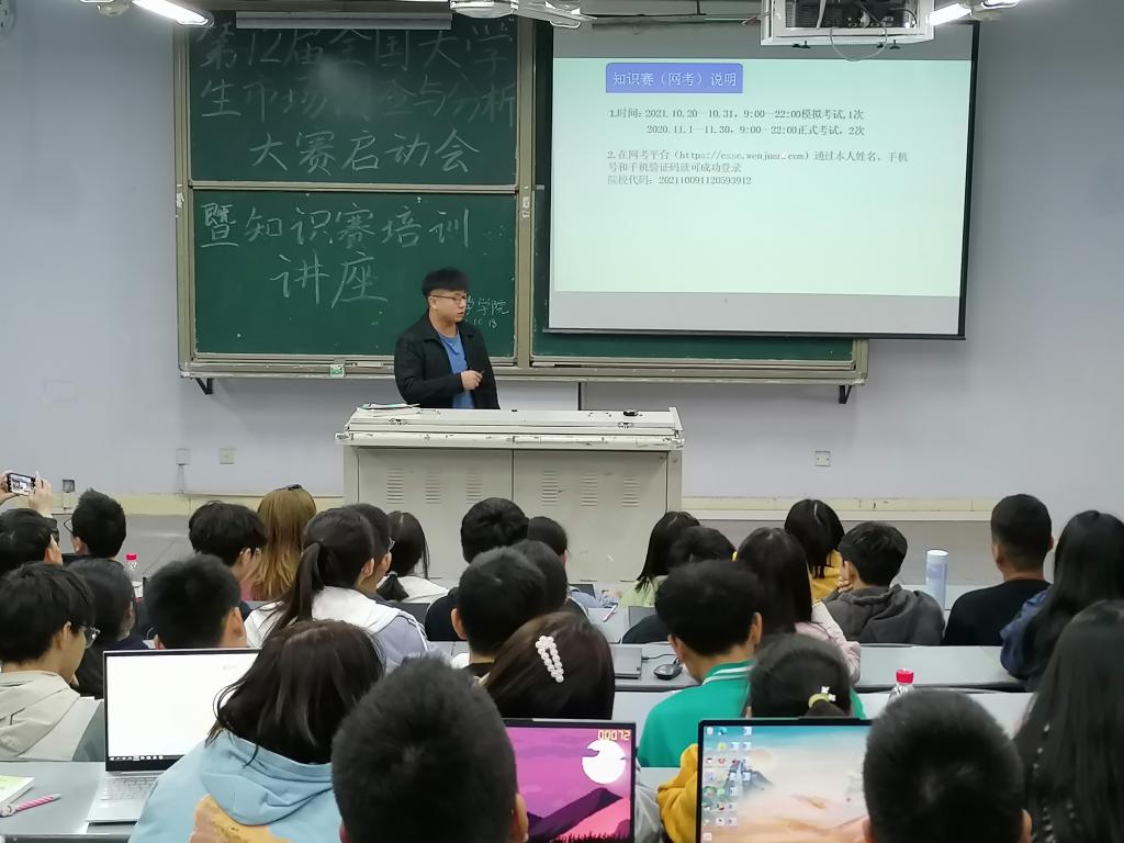 2021年10月18日下午5点,由公司承办的“第十二届全国老员工市场调查与分析大赛启动会暨知识赛培训讲座”在博文楼112教室举行。参加此次会议的有TapTap应用统计学教研室主任郑宗剑,专业课老师李骏、代雯月、官政,及2019级、2020级、2021级应用统计学专业的员工。