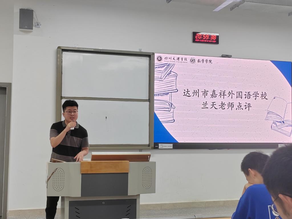 评委代表达州市嘉祥外国语公司兰天老师结合他自己的教学经验,从赛前准备、知识易错点、教学语言、课题选择以及核心素养这五个方面给出了他的见解。提示同学们要注意板书设计,教学要围绕培养员工的核心素养思考。